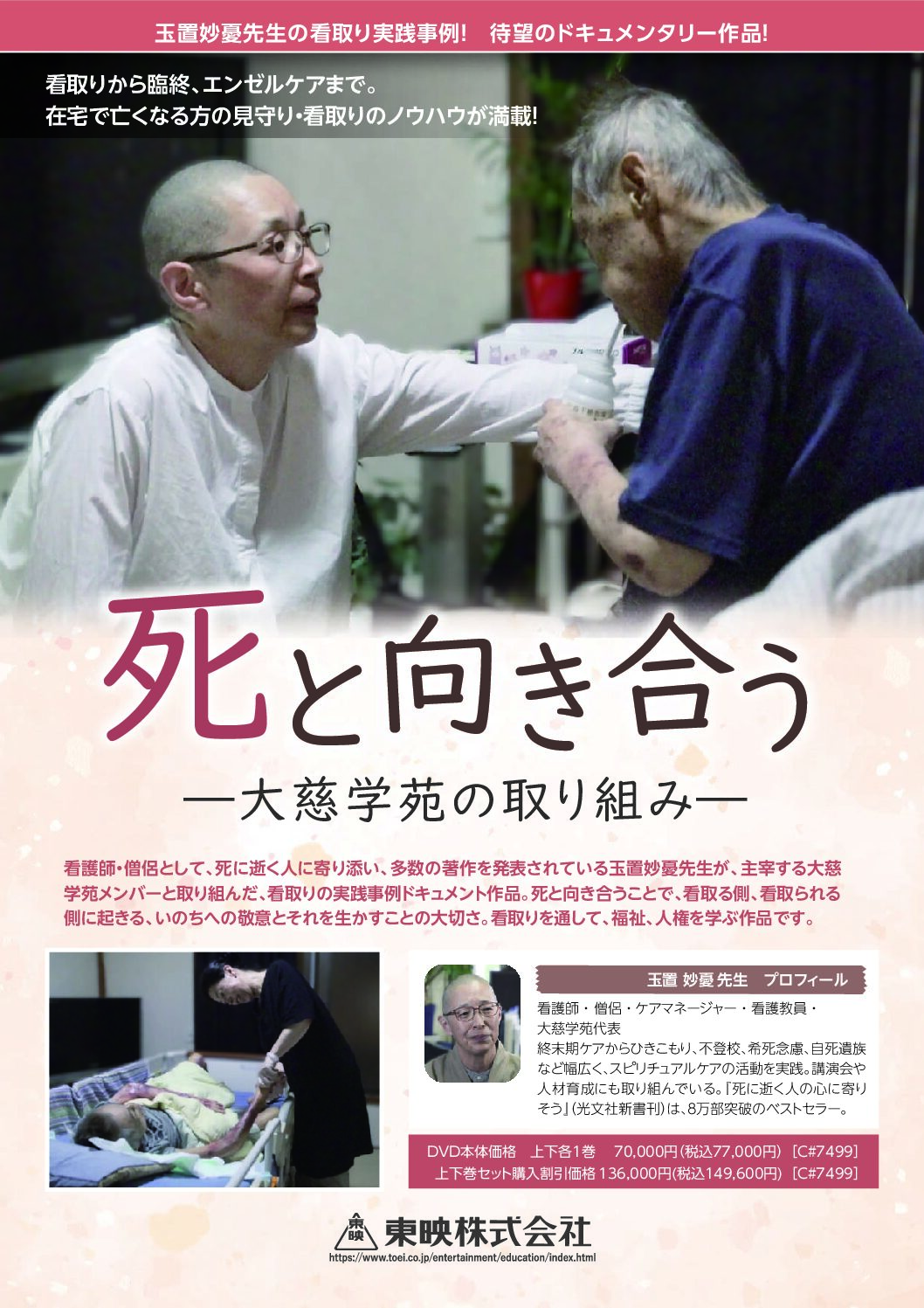 少子高齢化に伴い、病院で死を看取ることが難しい時代になっています。また、高齢単身者世帯の増加により、孤立死も増え続けています。本作品は、今後、増大する介護・看取りの中で、どう家庭で、地域で死を看取るかを考えるために制作されました。看取りの基礎知識のほか、福祉の網の目からこぼれ落ちる人々を地域行政、地域医療、福祉、そして地域の人々の力でどう看取っていくかを考えるドキュメンタリー作品です。