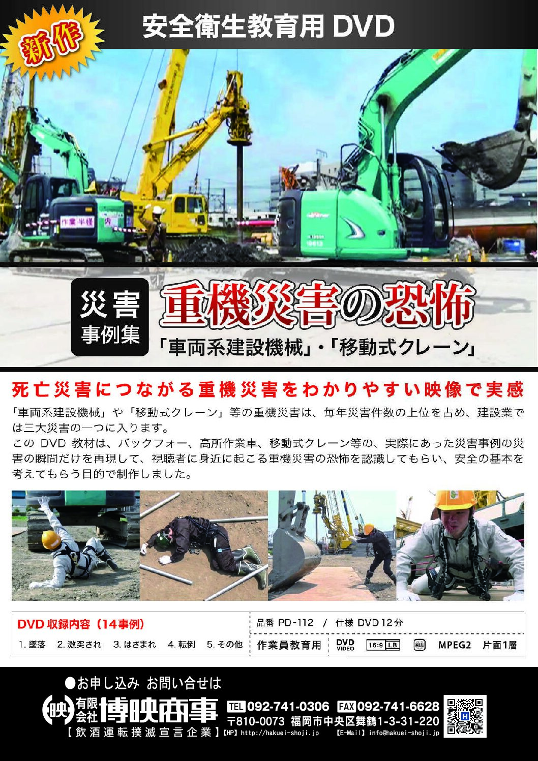 「車両系建設機械」や「移動式クレーン」等の重機災害は、毎年、災害件数の上位を占め、建設業では三大災害の一つに入ります。このDVD教材は、バックホー、高所作業車、移動式クレーン等の、実際にあった災害事例の「災害の瞬間だけ」を再現し、視聴者に身近に起こる重機災害の恐怖を認識してもらい、安全の基本を考えてもらうことを目的に制作しました。