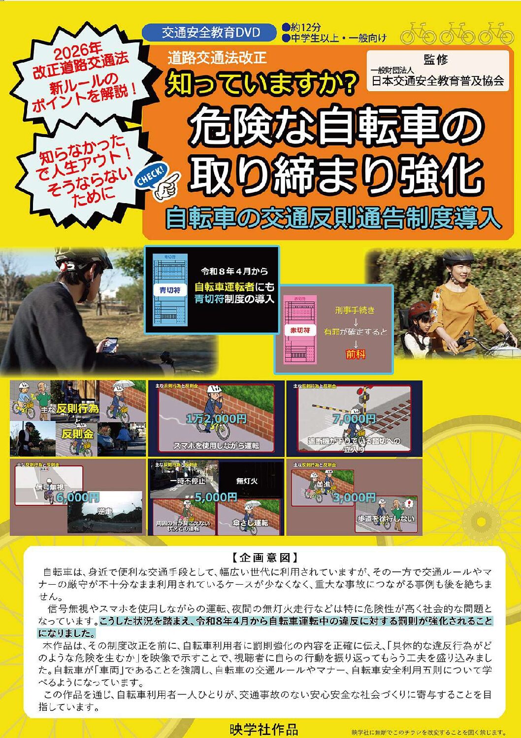 本作品では、令和8年4月からの制度改正を前に自転車利用者に罰則強化の内容を正確に伝え、「具体的な違反行為がどのような危険を生むか」を映像に示すことで、視聴者に自らの行動を振り返ってもらう工夫を盛り込みました。自転車が「車両」であることを強調し、自転車の交通ルールやマナー、自転車安全利用五則について学べるようになっています。この作品を通じ、自転車利用者一人ひとりが、交通事故のない安心安全な社会づくりに寄与することを目指しています。【2025年11月制作】